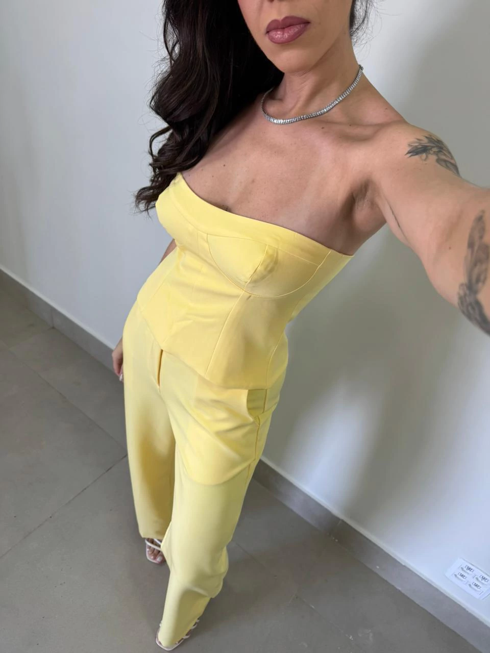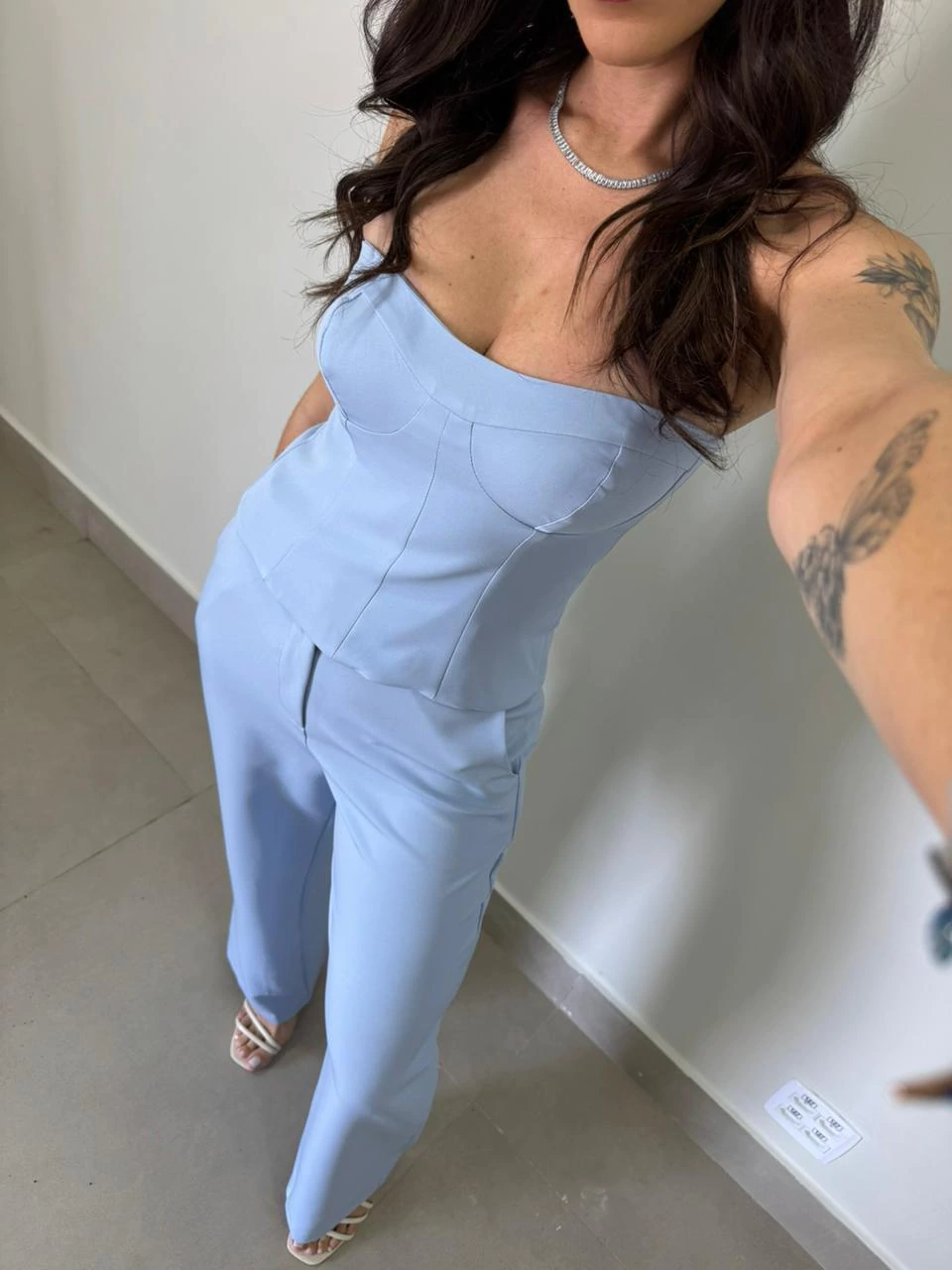 Conjunto sofisticado confeccionado em tecido encorpado de alta qualidade, que valoriza o caimento e proporciona um toque elegante ao visual.