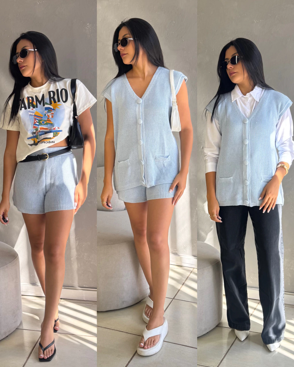 Conjunto confeccionado em tricot leve e confortável, com textura delicada e caimento impecável. A parte superior é um colete com decote em V, botões frontais forrados e bolsos aplicados, trazendo um toque moderno e charmoso ao visual. O shorts possui elástico na cintura, garantindo conforto e ajuste perfeito ao corpo.