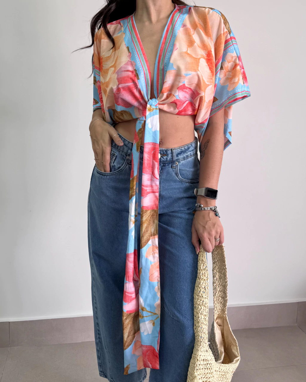 Cropped confeccionado em tecido leve e fluido, com estampa floral que traz um toque alegre e sofisticado à produção. O modelo possui mangas amplas e amarração frontal.