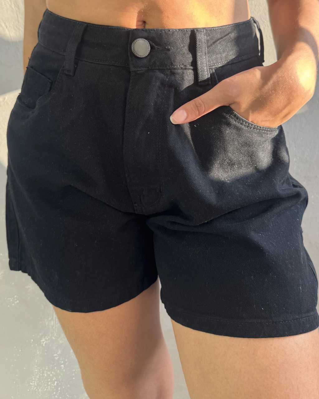 Short confeccionado em jeans encorpado, com toque macio e modelagem reta. Apresenta cintura média, bolsos funcionais, passantes para cinto e fechamento com zíper e botão.