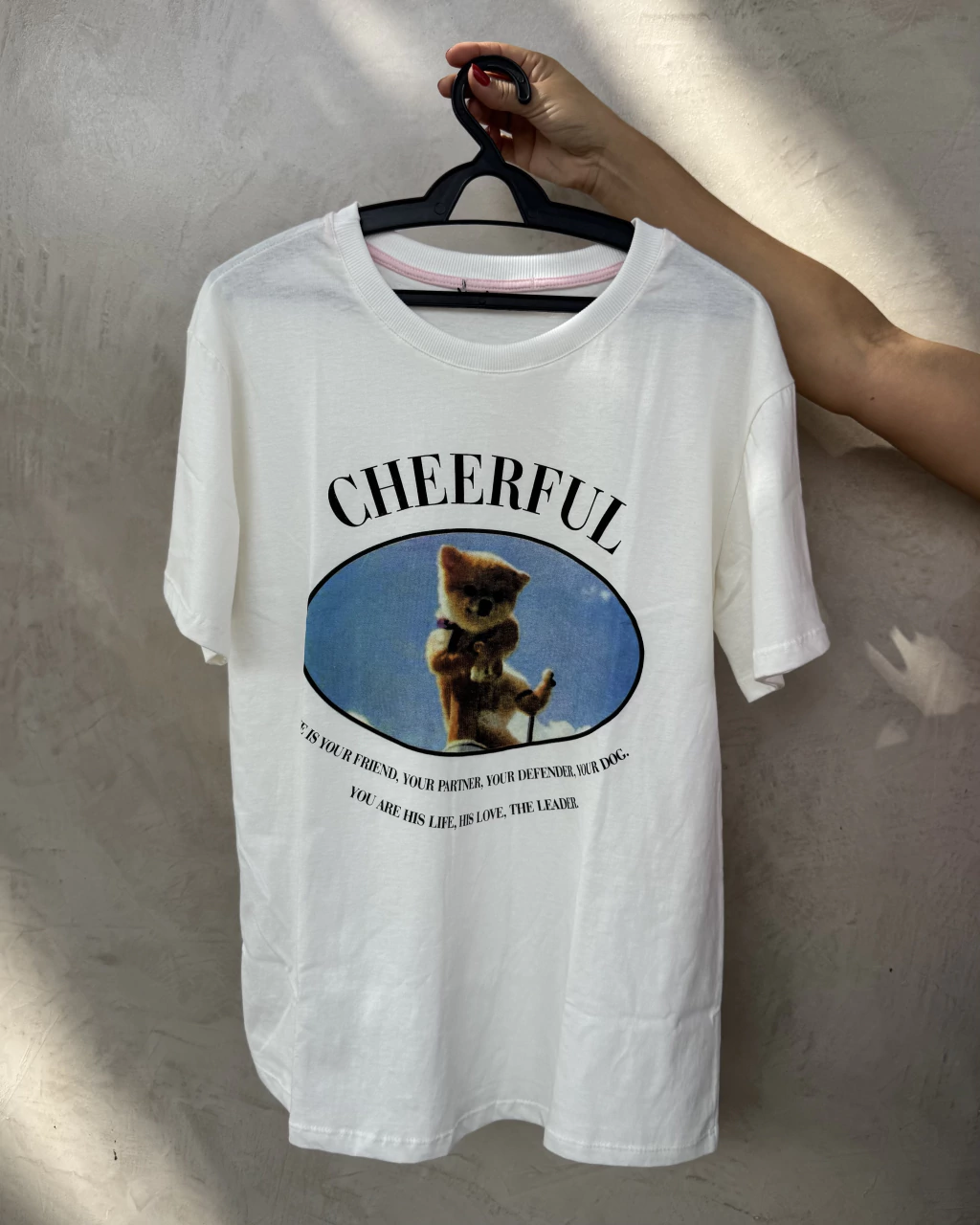 Camiseta em algodão com estampa fofa de gatinho e frase “Cheerful” (animado). Modelagem clássica e caimento leve, ideal para o dia a dia com um toque de charme e humor.